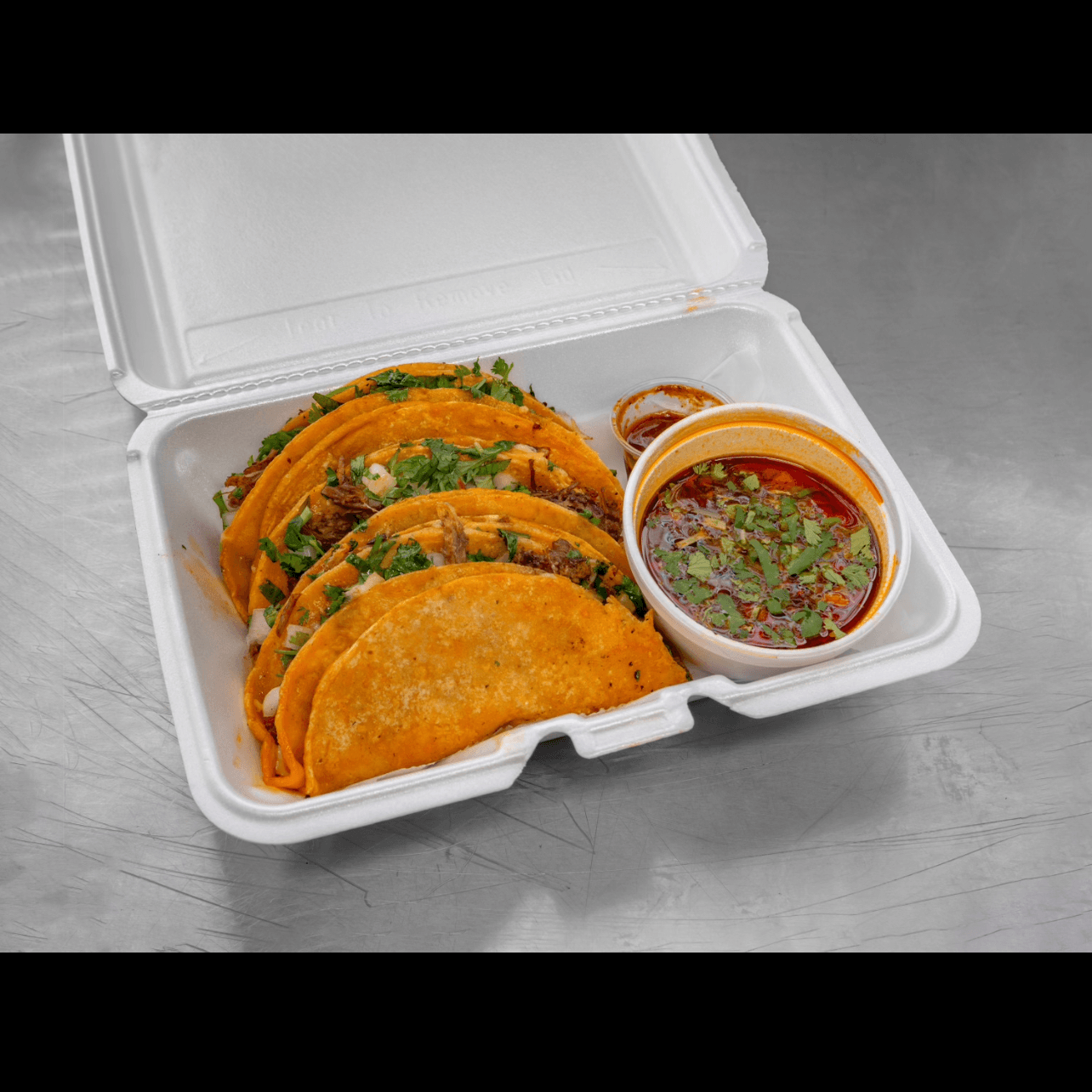 3 FRIED TORTILLA SHELLS FILLED WITH MELTED CHEESE, STEAK, CILANTRO AND ONIONS. SERVED WITH A SIDE OF CONSOME (BIRRIA BROTH) AND SPICY CHILI OIL